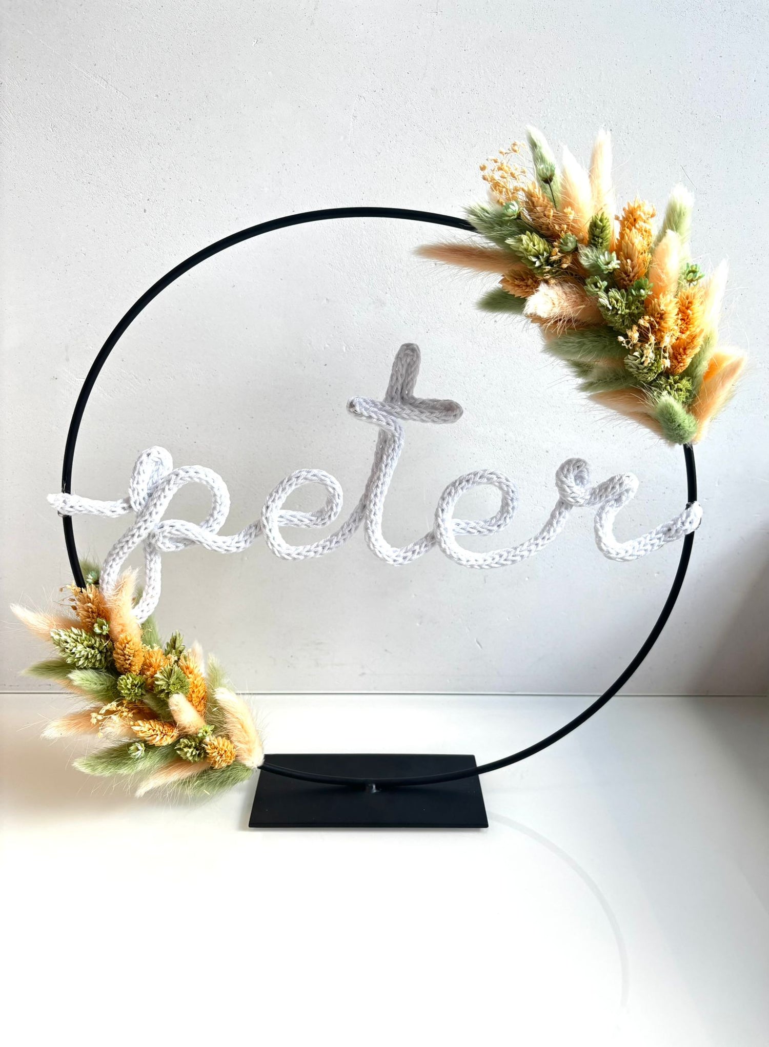 Ontdek onze gepersonaliseerde naamcirkels: een prachtig pronkstuk voor op het feest of tijdens de fotoshoot, en daarna een blijvende herinnering voor in de kamer.