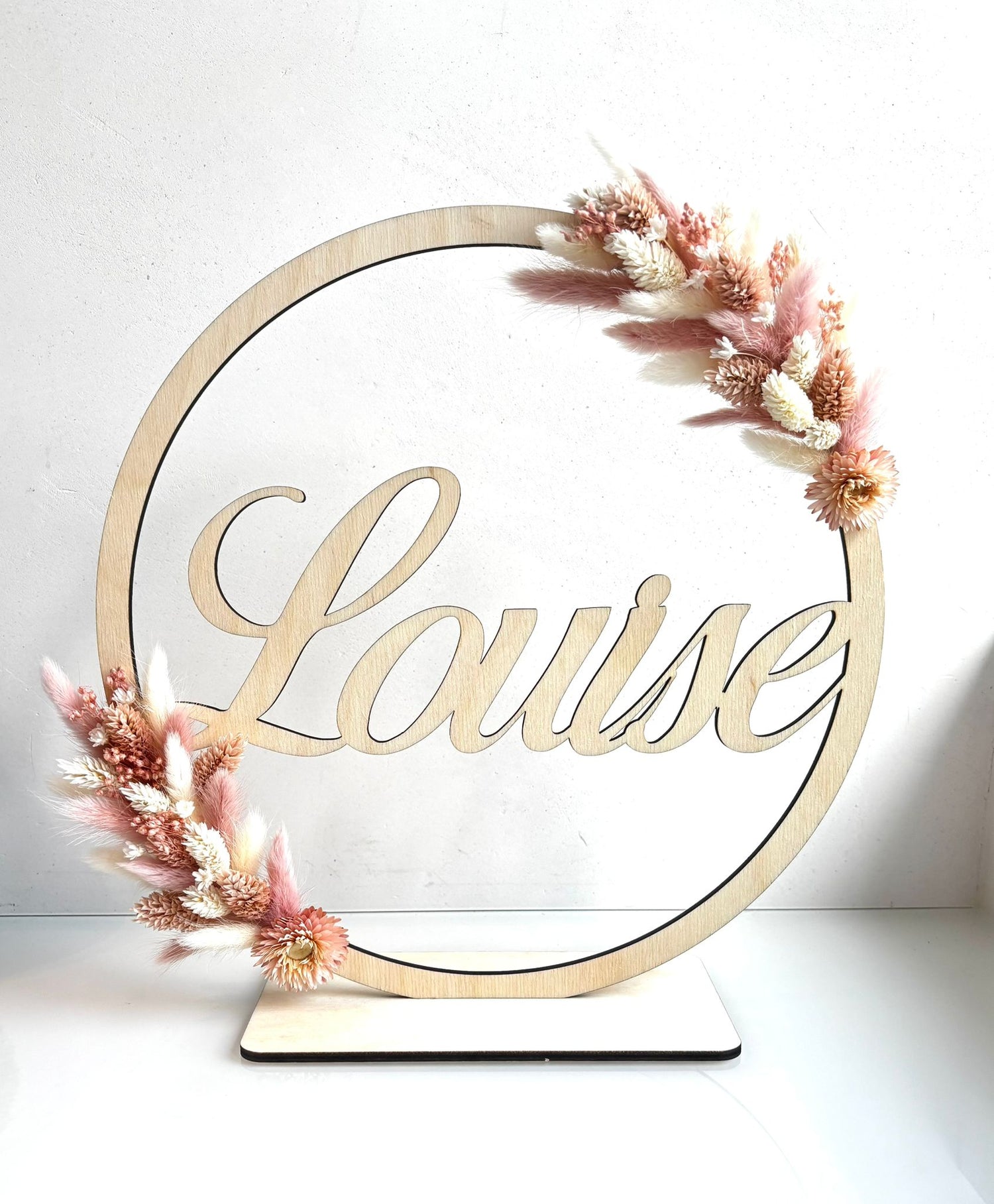 Een houten naamcirkel met droogbloemen is een uniek en persoonlijk aandenken bij de geboorte van je kindje. De naam van het kindje wordt centraal geplaatst en afgewerkt met droogbloemen in kleuren die perfect passen bij het kamertje, het geboortekaartje of volledig naar wens.