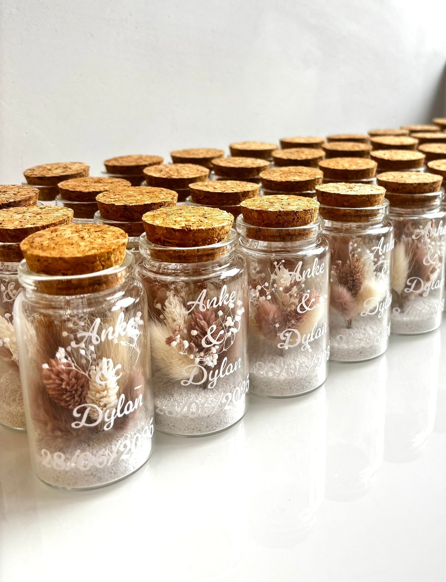 Bedank je gasten op een persoonlijke en duurzame manier met trouwbedankjes van droogbloemen. Of het nu gaat om gevulde potjes of buisjes, elk exemplaar wordt met zorg samengesteld en past perfect bij de stijl van jullie bruiloft.